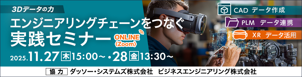 | 内容 | ■ 講 演 紹 介 ■ *=* 1日目(11月27日) *===========================* 【基 調 講 演 1】製品力と販売力の強化に向けたデジタルシステムとビジネス変革 (ダッソー・システムズ株式会社 講演)今後、日本の製造業も人口減少や業界再編など大きな社会変化への対応が必要になります。 従来のビジネスモデルからの変革に向けて必要となる、”製品力と販売力の強化を支える デジタルシステムの使い方”についてご紹介します。 ------------------------------------------- 【セッション1】ものづくり全体を見据えた3Dデータの作成と活用 3次元CADソフトウェア「SOLIDWORKS」は、3次元設計・製品設計・図面作成・コミュニケーション機能を兼ね備えてた操作性に優れた3DCADソリューションです。 しかし、時間をかけて作成した3Dデータが限られた部門だけでの利用となり、ものづくりのプロセスの中で活用できていないケースもあるのではないでしょうか。設計だけでなく、ものづくり全体の業務プロセスの変革を推進する「エンジニアリングDX」を進めるために、有益な3Dデータをどのように作成すればいいか、どのような部門で活用できるか、ご紹介します。 *=* 2日目(11月28日) *===========================* 【基 調 講 演 2】PLMを起点に実現するQCDEマネジメント ― mcframeで広がるBOMデータ連携の力 (ビジネスエンジニアリング株式会社 講演)近年、製造業に求められる競争力の指標は「QCD(品質・コスト・納期)」から、「E(Environment:環境)」を含むQCDEへと進化しています。製品ライフサイクル全体を俯瞰し、設計段階から環境・原価・生産性を見通す“持続可能なものづくり”が、企業価値を左右する時代です。 mcframe PLMは、設計情報とBOMを中核に、他のmcframeファミリー製品や、他システムと連携することで設計から経営まで一貫したシステム基盤を実現します。 本セミナーでは、各システムとBOMデータ連携することでどのようにQCDEが高まるのかを解説します。 ------------------------------------------- 【セッション2】製品情報の一元管理を可能にするPLM mcframe PLMは、BOMシステムの基本要件をパッケージ機能とするだけでなく、設計/生産の双方向連携によるQCD(品質、価格、納期)の作り込みを可能とし、製品開発から生産までの効率化/標準化、原価低減を支援する製品情報管理システムです。 今回は、情報一元化について、mcframe PLMでいかに解決するか、ご紹介します。 ------------------------------------------- 【セッション3】PLMとXR技術の連携による設計・製造プロセスの改善 PLMで管理された3Dデータを活用し、XR(拡張現実、仮想現実、混合現実)技術を通じて設計レビュー、組立指示等の作業を改善する方法や事例についてをご紹介します。 また、実際にPLM上の3Dデータ(XVLデータ)をXR環境でどのように視覚化するまでの手順もご説明します。 |