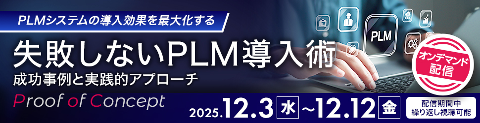 内容 | 1.PLMの導入に悩んでいる、失敗する理由 ~ 陥りやすい落とし穴~ PLM導入において、よくある失敗とその原因を紹介いたします。 2.PoCの概要と重要性 ~ 失敗を避けるためのアプローチ~ PLM導入の失敗を避けるためのアプローチとして、PoCの重要性とメリット、PoC実施の流れを解説いたします。 3.PoCを実施したPLM導入事例 ~ 成功から学ぶ~ PoCを実施したPLM導入の成功事例を紹介いたします。 |